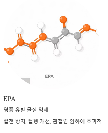 | EPA | 염증 유발 물질 억제 | 혈전 방지, 혈행 개선, 관절염 완화 |