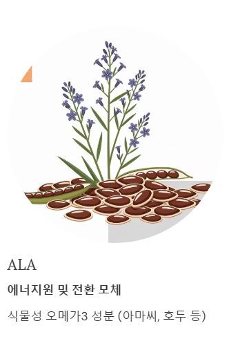 | ALA | 에너지원 및 전환 모체 | 식물성 오메가3 성분 (아마씨 등) |