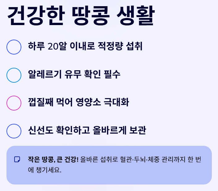 땅콩 효능은 심혈관 건강과 두뇌 활성화, 체중 조절에 탁월하지만, 고칼로리이므로 하루 20알 내외의 권장량을 지키고 알레르기 유무를 확인하며 껍질째 섭취하는 것이 가장 건강한 땅콩 섭취방법입니다.