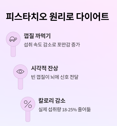 - 피스타치오 원리(Pistachio Principle): 껍질이 있는 피스타치오를 까먹는 행위는 섭취 속도를 늦춰 뇌가 포만감을 느낄 시간을 벌어줍니다. 또한, 눈앞에 쌓인 빈 껍질 시각적 잔상이 '이미 많이 먹었다'는 신호를 뇌에 보내어 실제 칼로리 섭취량을 약 18%~25% 감소시킨다는 연구 결과가 있습니다.