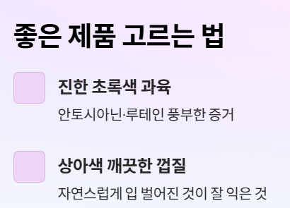 - 과육의 색상: 속살의 초록색이 진할수록 항산화 성분인 안토시아닌과 루테인이 풍부하다는 증거입니다.