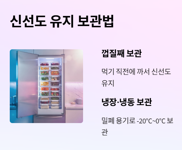 - 냉장/냉동 보관: 장기 보관 시에는 밀폐 용기에 담아 냉장고(-20°C~0°C)에 두는 것이 맛과 영양 파괴를 최소화하는 방법입니다.