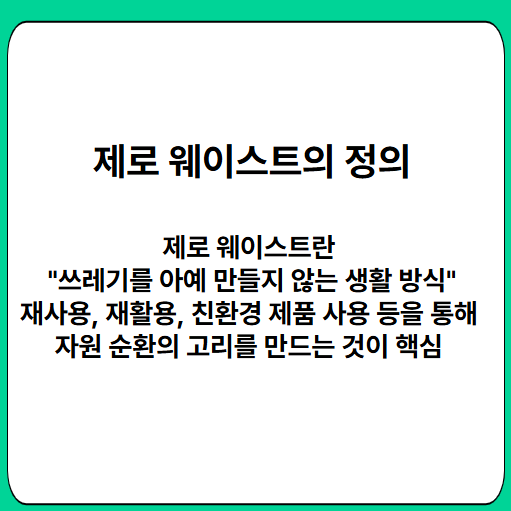 제로 웨이스트란 "쓰레기를 아예 만들지 않는 생활 방식"을 의미합니다. 재사용, 재활용, 친환경 제품 사용 등을 통해 자원 순환의 고리를 만드는 것이 핵심입니다.
